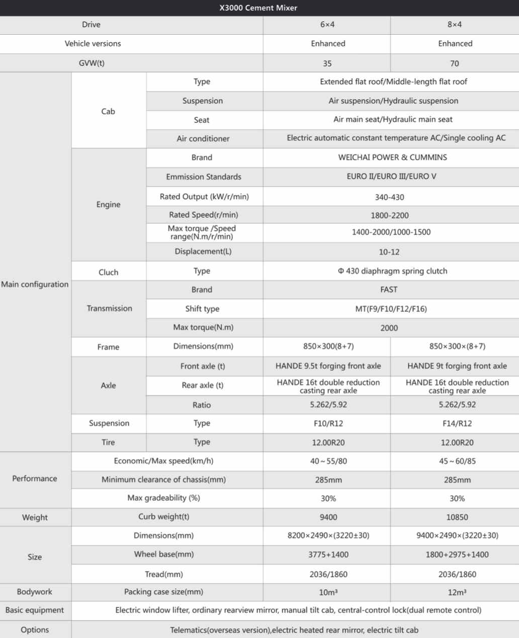 Şassi, Wuxi ChaiWei WP10 / WP12 mühərrikləri ilə təchiz edilmiş, 350 ilə 460 at gücünə qədər maksimum gücü ilə təchiz edilmişdir. Fatai 12 pilləli ötürmə və mürəkkəb tikinti sahəsinin şərtləri üçün uyğun olan 12 pilləli ötürmə və tutqun texnik oxu ilə uyğunlaşır. Kabin dörd nöqtəli asma dizaynını qəbul edir və hava yastığı şok əməli oturacaqlarla təchiz olunmuşdur, sürücünün rahatlığını xeyli artırır. Tank səthi korroziyaya qarşı sandblasting müalicəsinə məruz qalır və betondan yapışmamaq üçün əlavə bir sprey sistemi quraşdırıla bilər. Arxa boşalma chute 270 dərəcə dönə bilər və əməliyyat qolu, tək nəfəri dəqiq bir idarəetmə asanlaşdıran nəqliyyat vasitəsinin sağ tərəfində mərkəzləşdirilmişdir. Bütün nəqliyyat vasitəsi Milli VI emissiya standartlarına uyğundur və şəhər inşaat layihələri üçün səmərəli və ekoloji cəhətdən təmiz bir beton nəqliyyat həllidir.